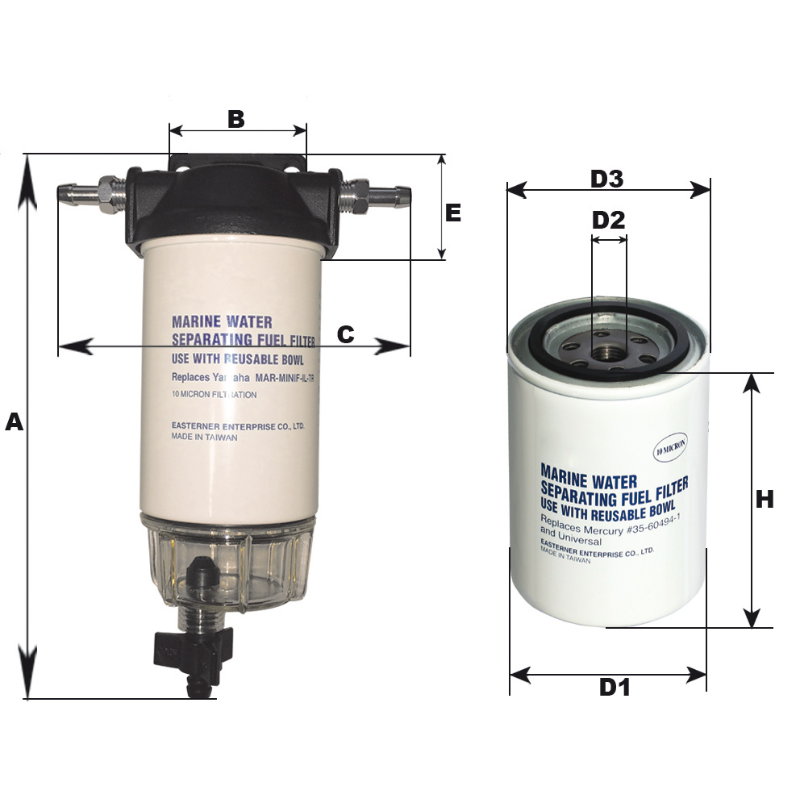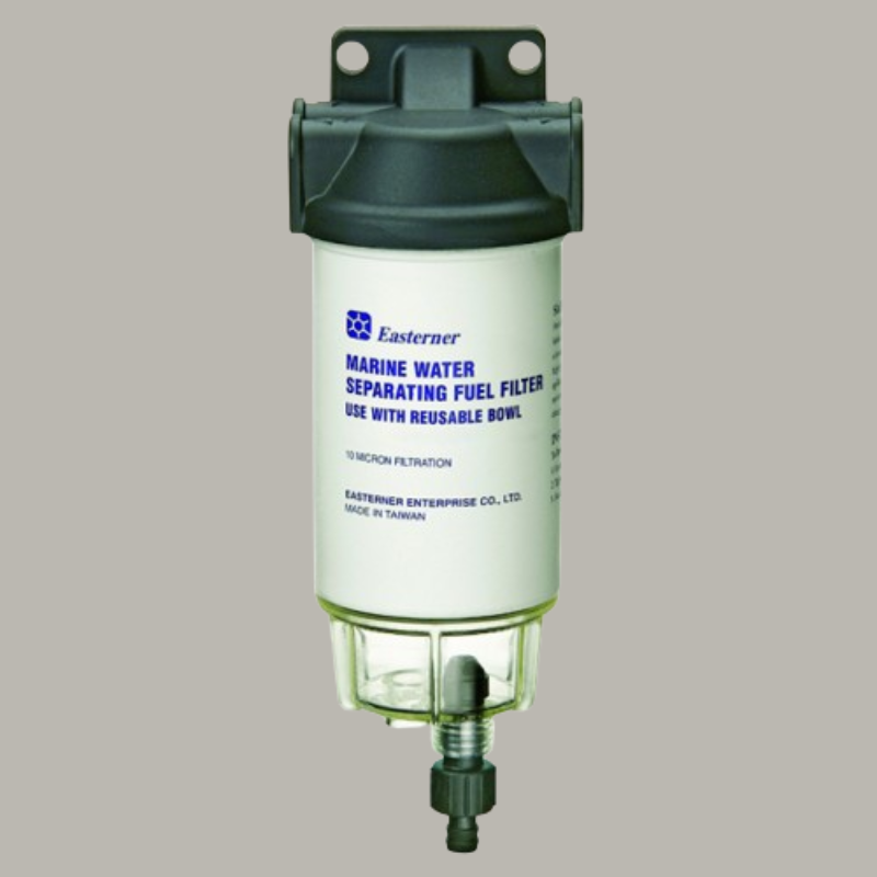 Filtro tipo Yamaha, universale per ogni tipo di motore fino a 200HP completo di cartuccia 10 micron, vaschetta trasparente con spurgo, 2 portagomma del diametro di 10mm e 2 tappi. Supporto costruito in lega leggera pressofusa verniciata nera.